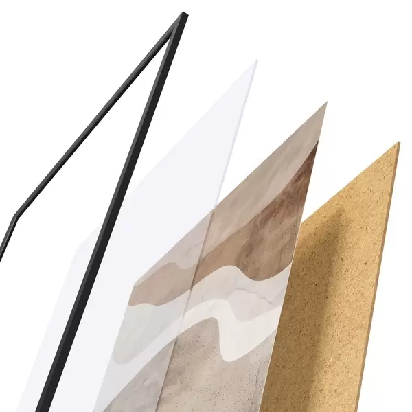 El póster consta de marco, plexiglás, imagen impresa y soporte de aglomerado. El póster puede colgarse inmediatamente en la pared gracias a los soportes de la parte posterior.