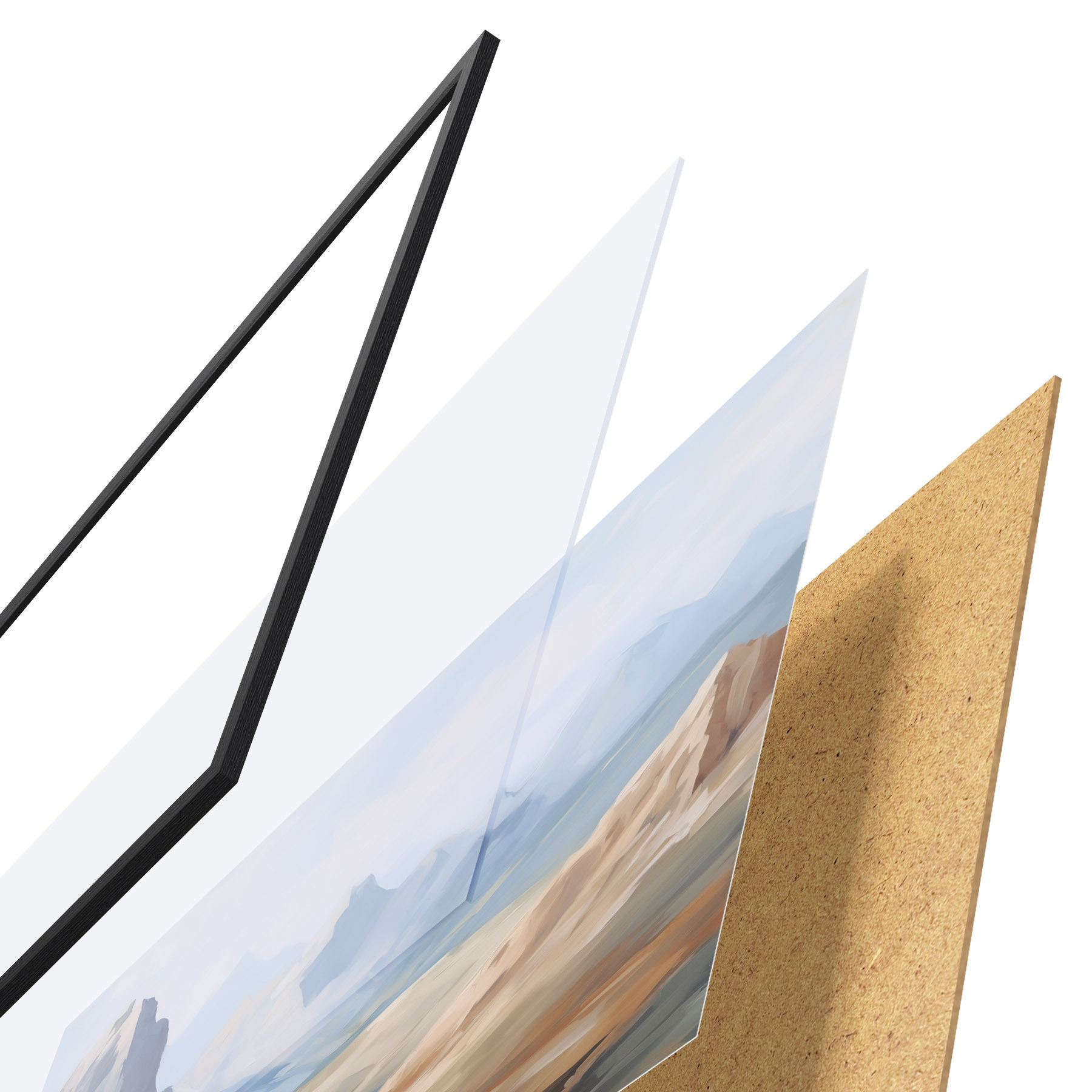 El póster consta de marco, plexiglás, imagen impresa y soporte de aglomerado. El póster puede colgarse inmediatamente en la pared gracias a los soportes de la parte posterior.