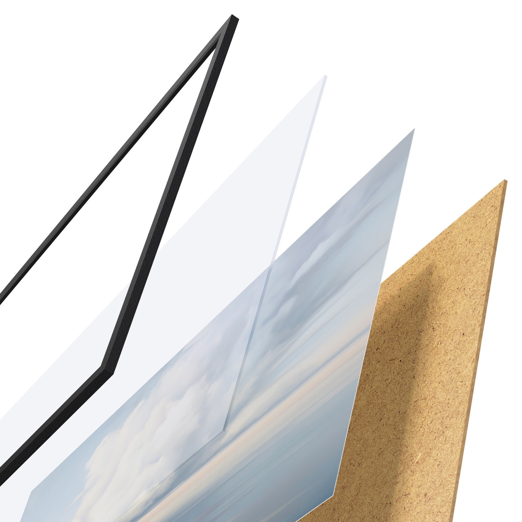 El póster consta de marco, plexiglás, imagen impresa y soporte de aglomerado. El póster puede colgarse inmediatamente en la pared gracias a los soportes de la parte posterior.