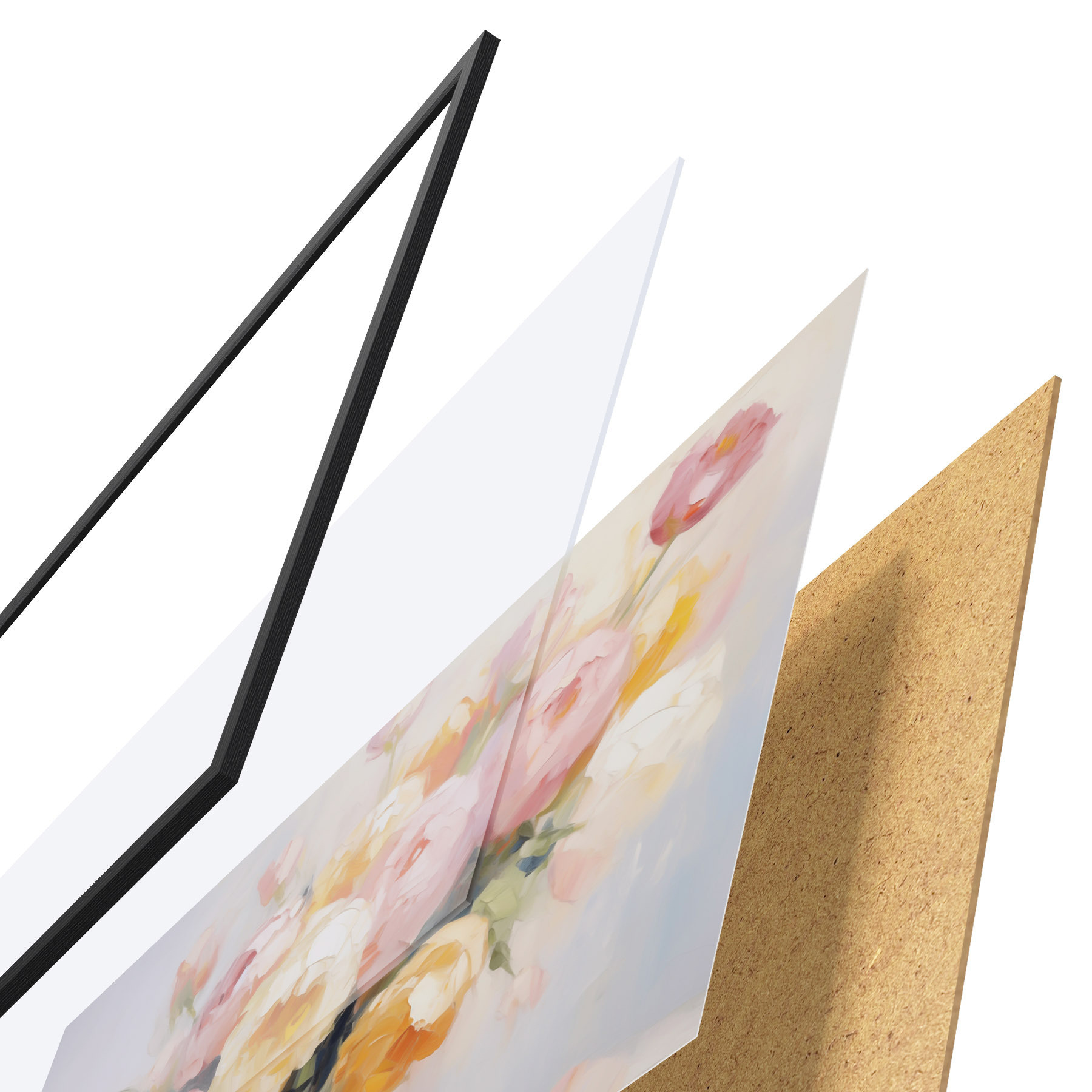 El póster consta de marco, plexiglás, imagen impresa y soporte de aglomerado. El póster puede colgarse inmediatamente en la pared gracias a los soportes de la parte posterior.