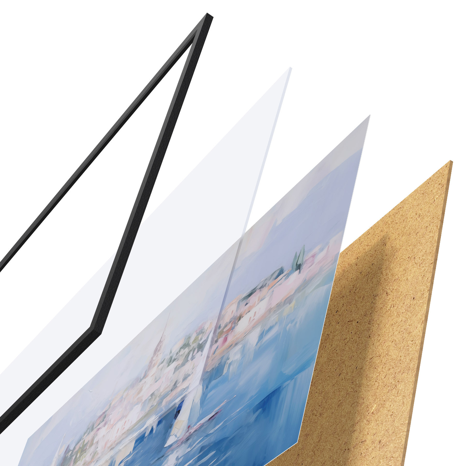 El póster consta de marco, plexiglás, imagen impresa y soporte de aglomerado. El póster puede colgarse inmediatamente en la pared gracias a los soportes de la parte posterior.
