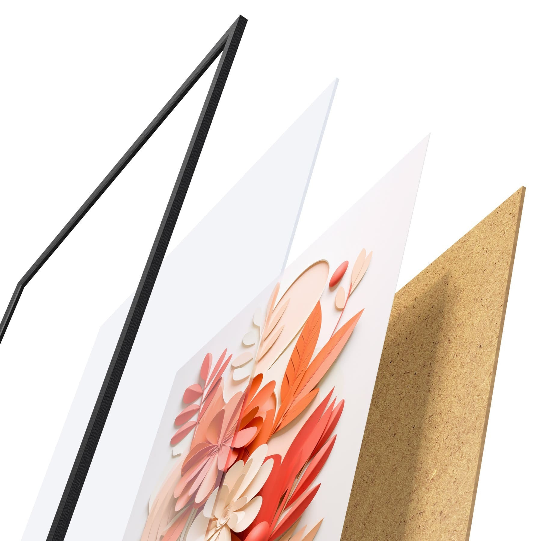 El póster consta de marco, plexiglás, imagen impresa y soporte de aglomerado. El póster puede colgarse inmediatamente en la pared gracias a los soportes de la parte posterior.