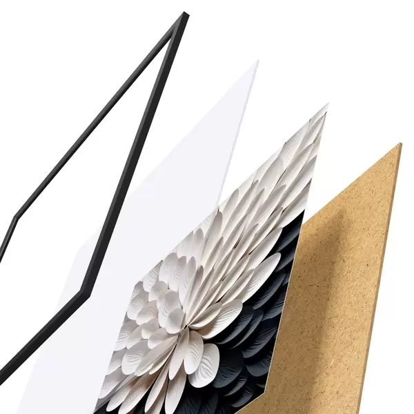 El póster consta de marco, plexiglás, imagen impresa y soporte de aglomerado. El póster puede colgarse inmediatamente en la pared gracias a los soportes de la parte posterior.