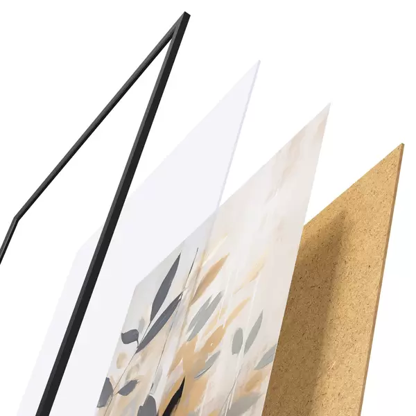 El póster consta de marco, plexiglás, imagen impresa y soporte de aglomerado. El póster puede colgarse inmediatamente en la pared gracias a los soportes de la parte posterior.