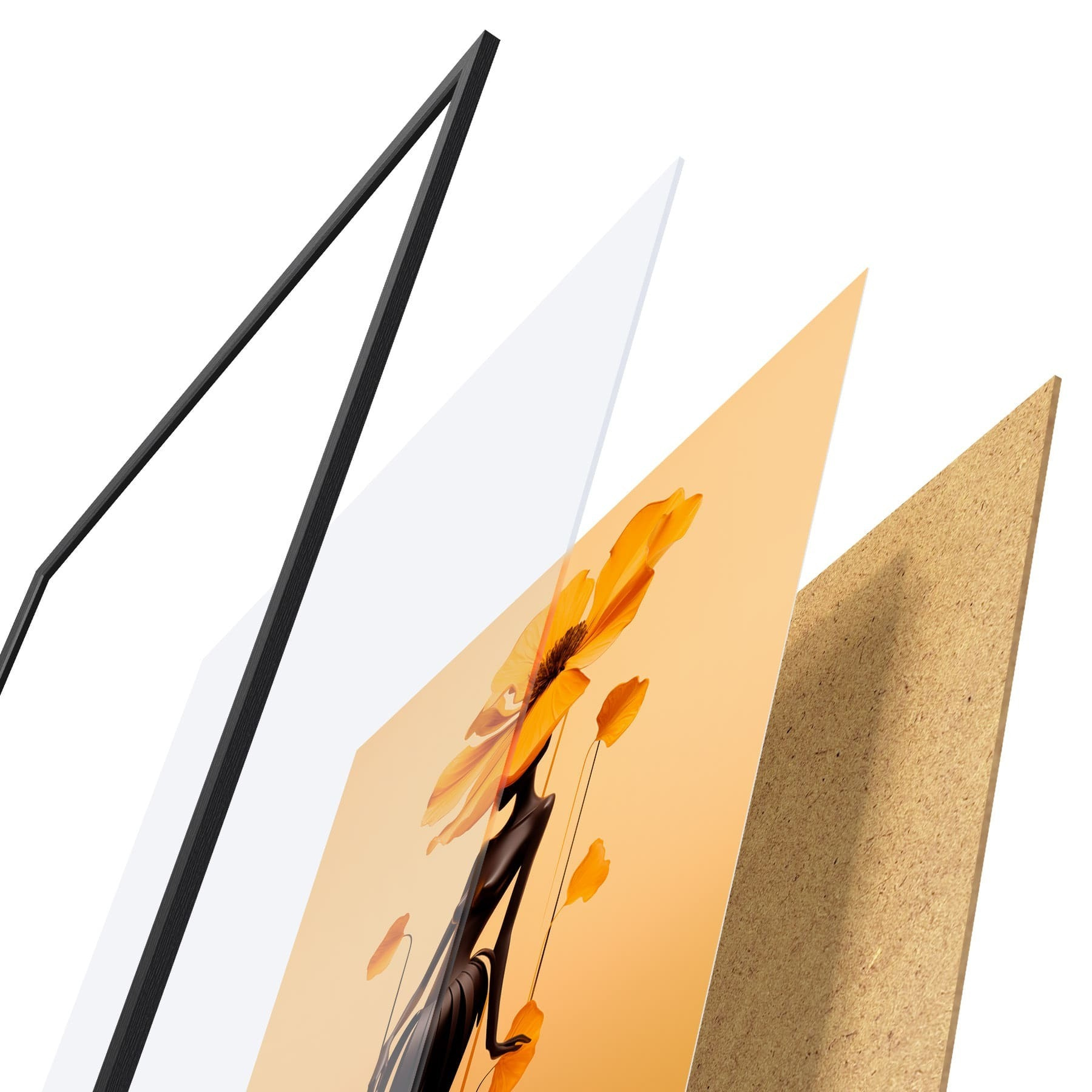 El póster consta de marco, plexiglás, imagen impresa y soporte de aglomerado. El póster puede colgarse inmediatamente en la pared gracias a los soportes de la parte posterior.
