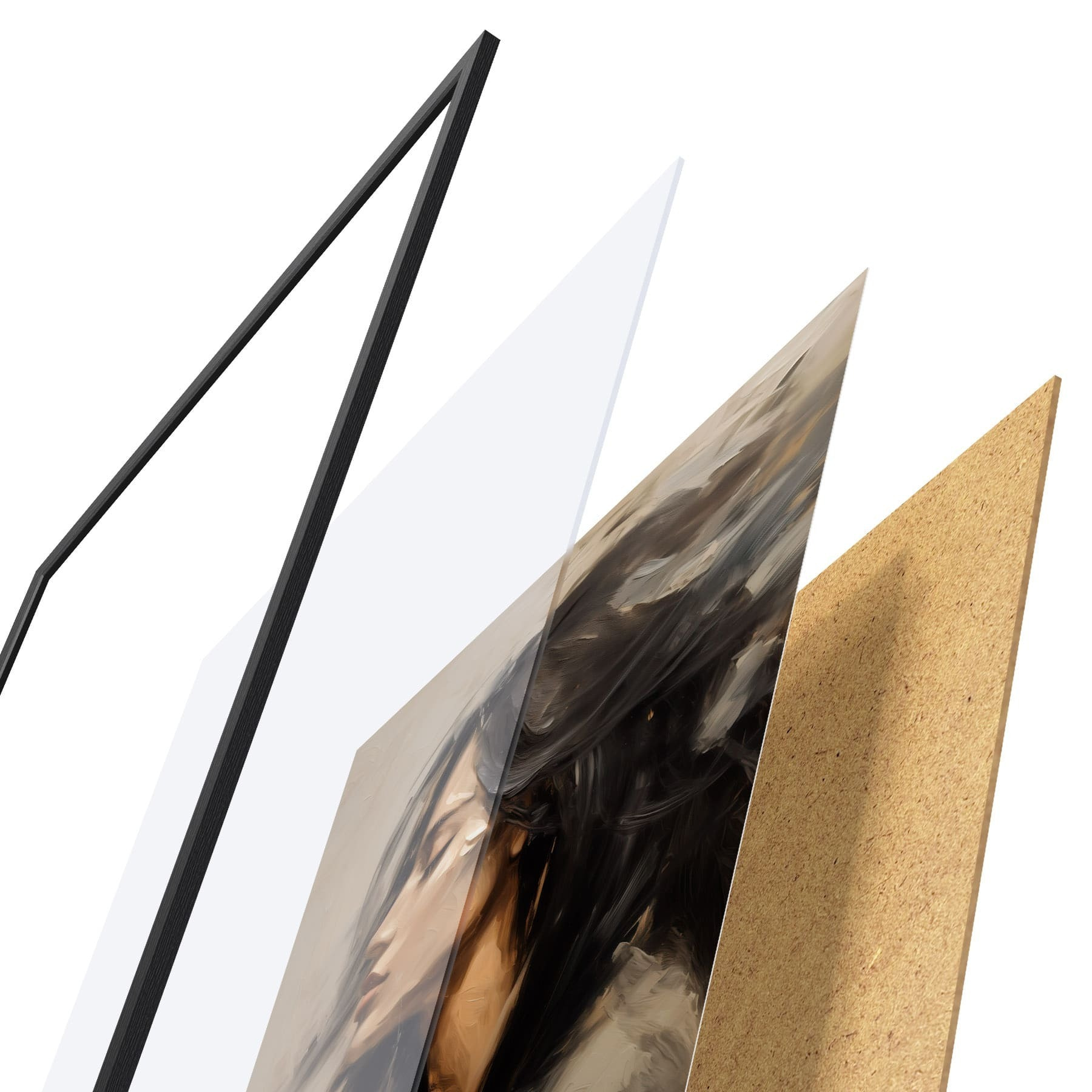 El póster consta de marco, plexiglás, imagen impresa y soporte de aglomerado. El póster puede colgarse inmediatamente en la pared gracias a los soportes de la parte posterior.