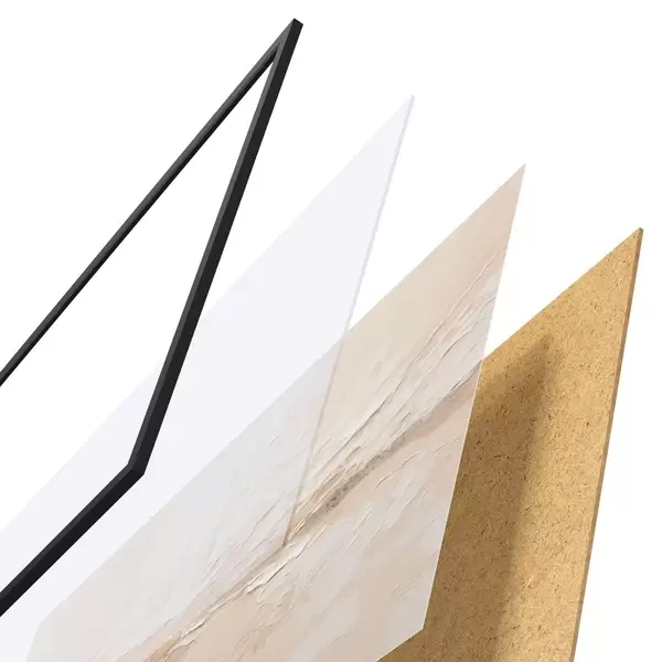El póster consta de marco, plexiglás, imagen impresa y soporte de aglomerado. El póster puede colgarse inmediatamente en la pared gracias a los soportes de la parte posterior.
