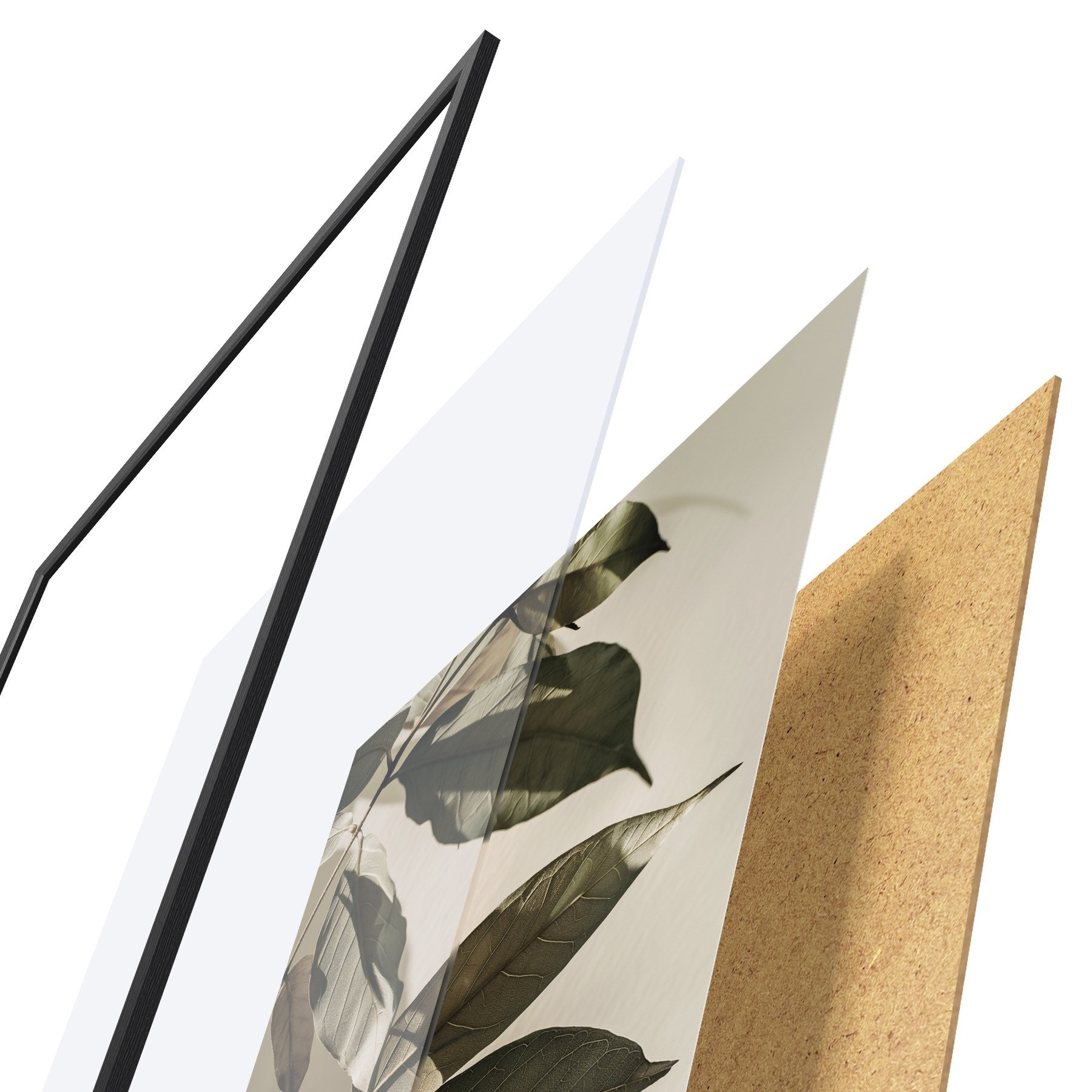 El póster consta de marco, plexiglás, imagen impresa y soporte de aglomerado. El póster puede colgarse inmediatamente en la pared gracias a los soportes de la parte posterior.
