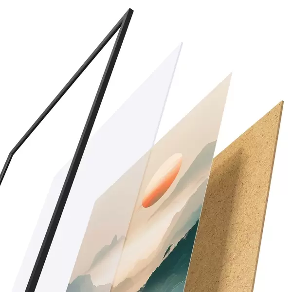 El póster consta de marco, plexiglás, imagen impresa y soporte de aglomerado. El póster puede colgarse inmediatamente en la pared gracias a los soportes de la parte posterior.
