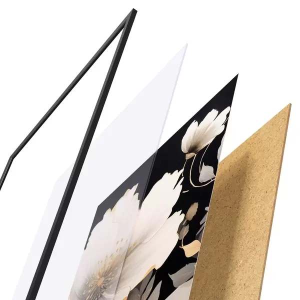 El póster consta de marco, plexiglás, imagen impresa y soporte de aglomerado. El póster puede colgarse inmediatamente en la pared gracias a los soportes de la parte posterior.