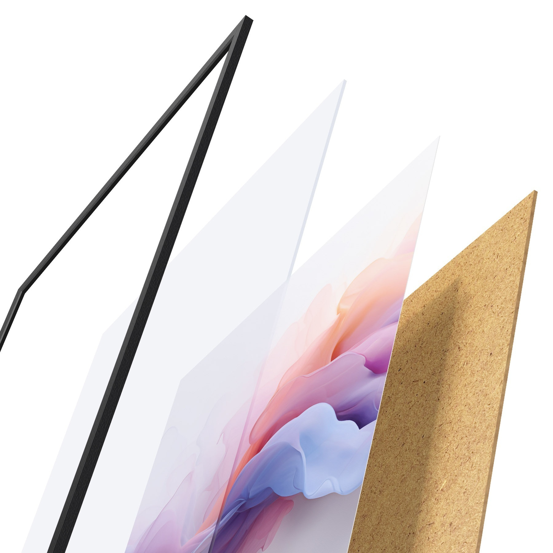 El póster consta de marco, plexiglás, imagen impresa y soporte de aglomerado. El póster puede colgarse inmediatamente en la pared gracias a los soportes de la parte posterior.
