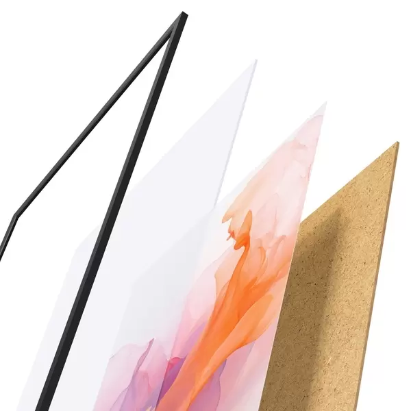 El póster consta de marco, plexiglás, imagen impresa y soporte de aglomerado. El póster puede colgarse inmediatamente en la pared gracias a los soportes de la parte posterior.