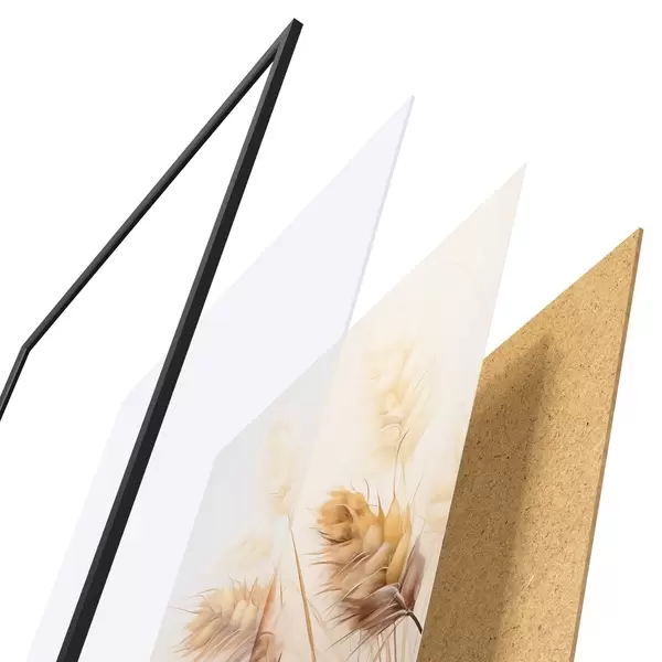 El póster consta de marco, plexiglás, imagen impresa y soporte de aglomerado. El póster puede colgarse inmediatamente en la pared gracias a los soportes de la parte posterior.