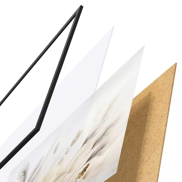 El póster consta de marco, plexiglás, imagen impresa y soporte de aglomerado. El póster puede colgarse inmediatamente en la pared gracias a los soportes de la parte posterior.