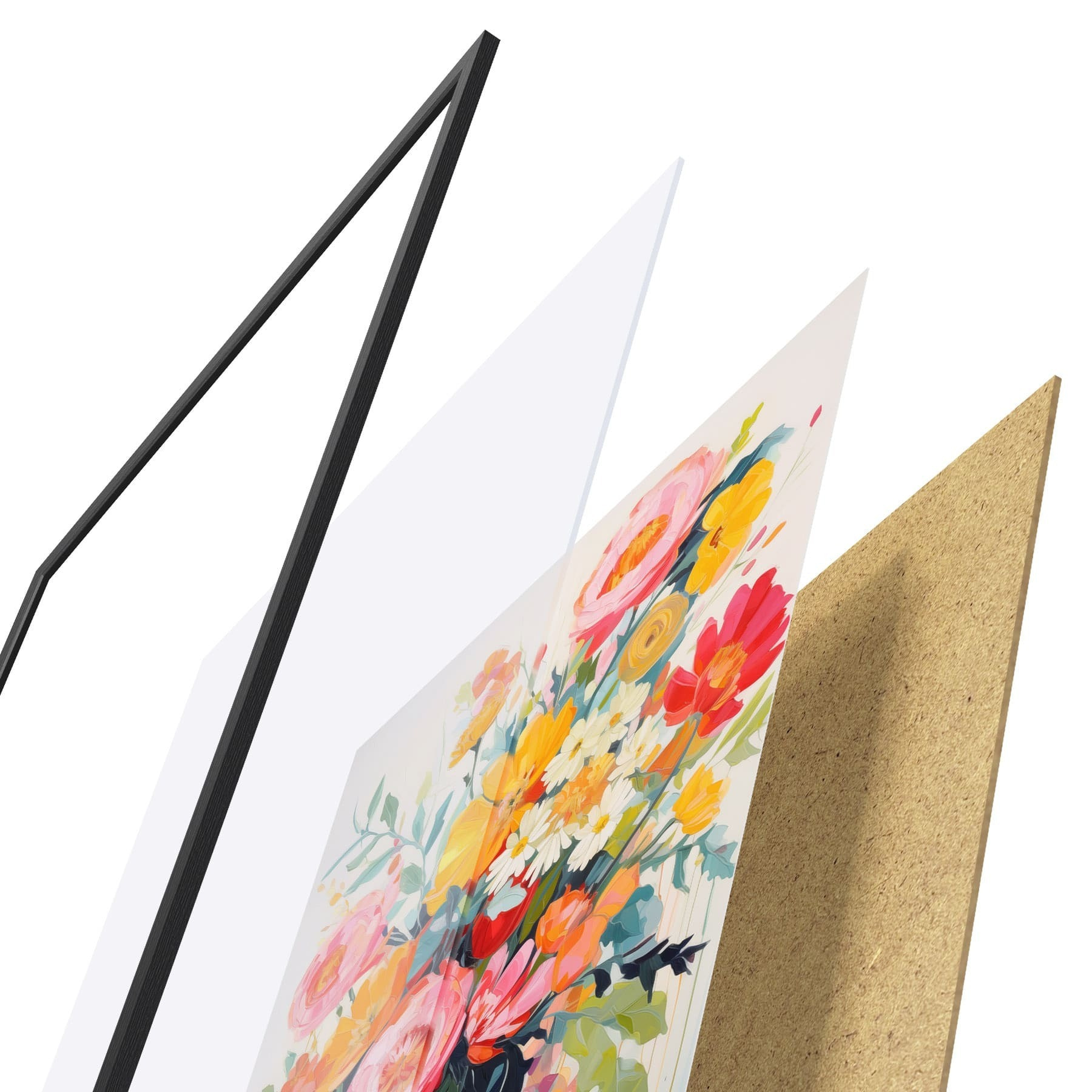 El póster consta de marco, plexiglás, imagen impresa y soporte de aglomerado. El póster puede colgarse inmediatamente en la pared gracias a los soportes de la parte posterior.