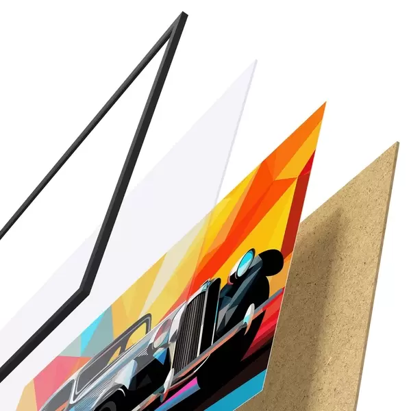 El póster consta de marco, plexiglás, imagen impresa y soporte de aglomerado. El póster puede colgarse inmediatamente en la pared gracias a los soportes de la parte posterior.