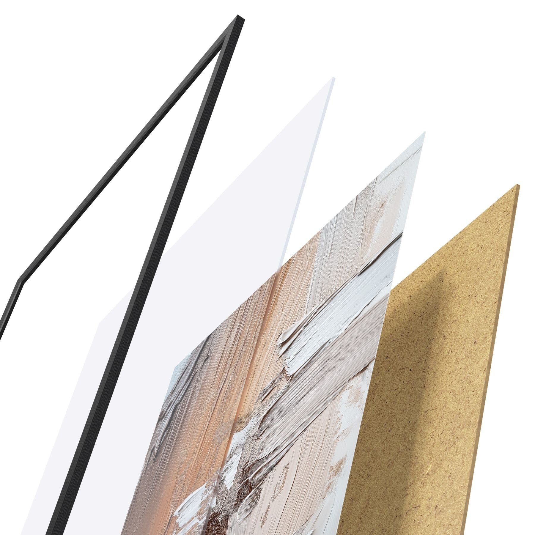 El póster consta de marco, plexiglás, imagen impresa y soporte de aglomerado. El póster puede colgarse inmediatamente en la pared gracias a los soportes de la parte posterior.