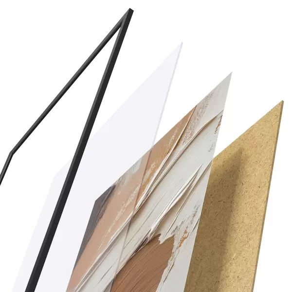 El póster consta de marco, plexiglás, imagen impresa y soporte de aglomerado. El póster puede colgarse inmediatamente en la pared gracias a los soportes de la parte posterior.