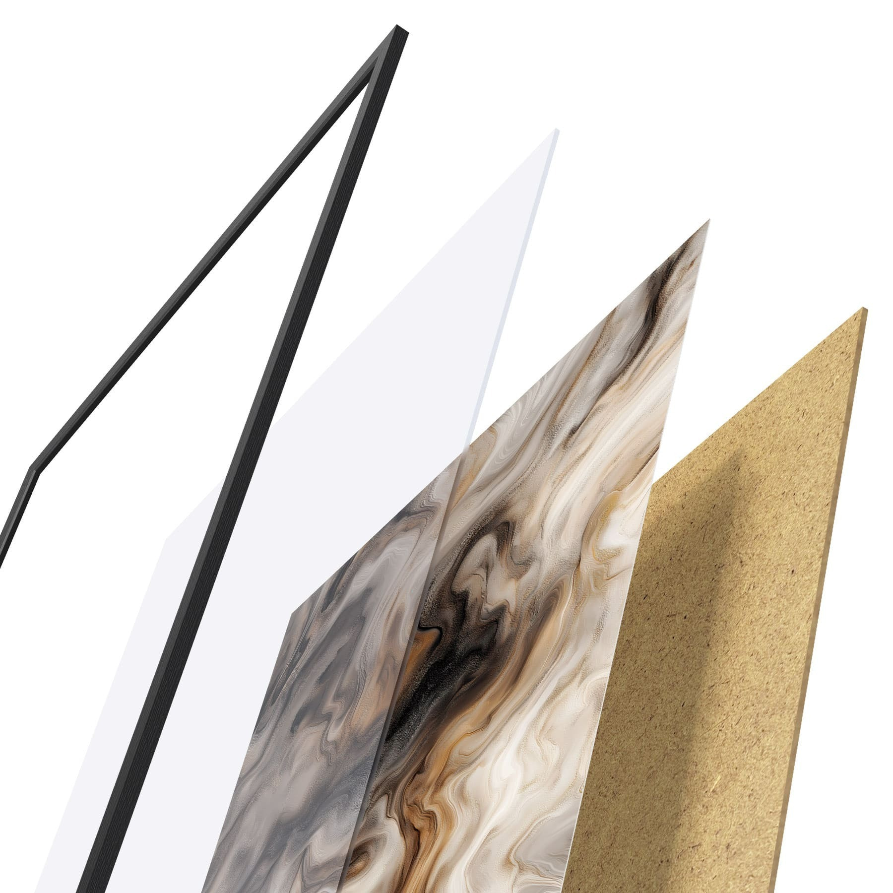 El póster consta de marco, plexiglás, imagen impresa y soporte de aglomerado. El póster puede colgarse inmediatamente en la pared gracias a los soportes de la parte posterior.
