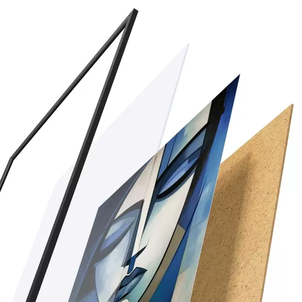 El póster consta de marco, plexiglás, imagen impresa y soporte de aglomerado. El póster puede colgarse inmediatamente en la pared gracias a los soportes de la parte posterior.