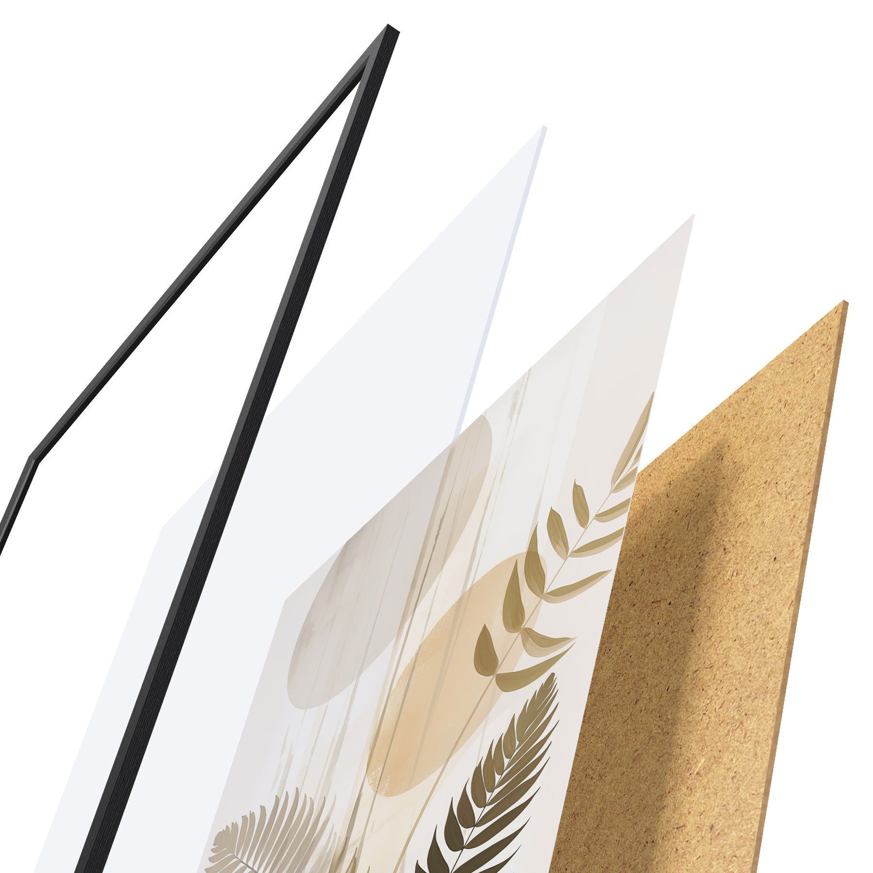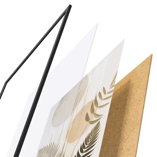 El póster consta de marco, plexiglás, imagen impresa y soporte de aglomerado. El póster puede colgarse inmediatamente en la pared gracias a los soportes de la parte posterior.