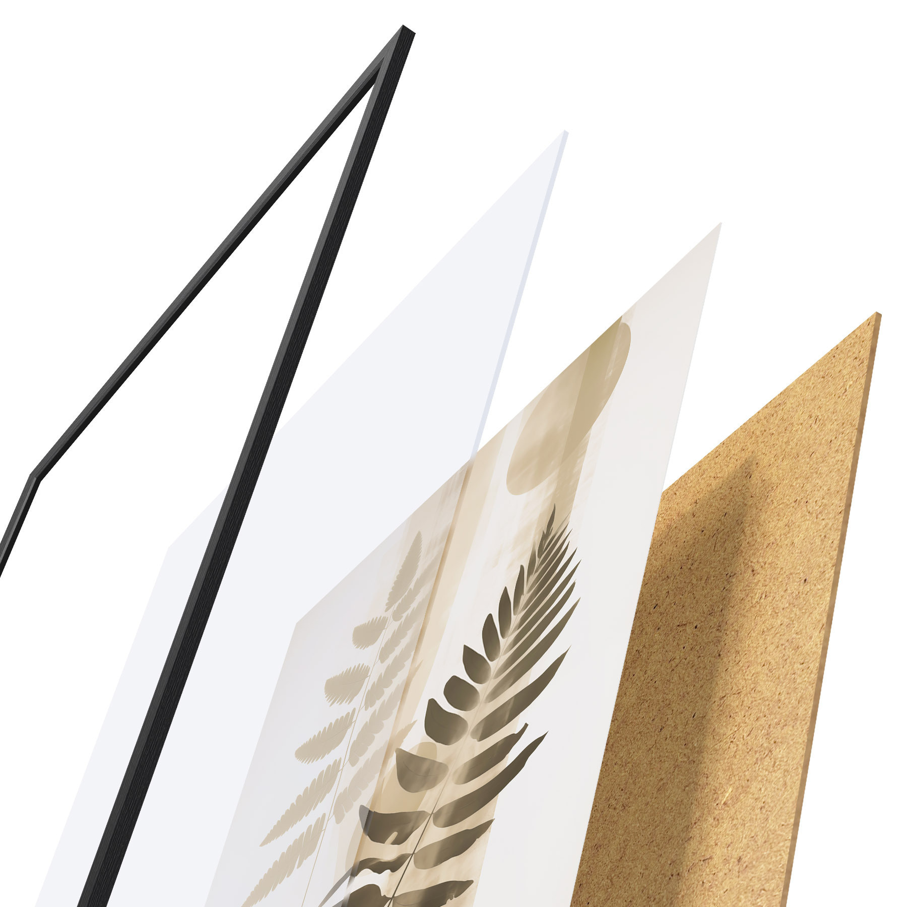 El póster consta de marco, plexiglás, imagen impresa y soporte de aglomerado. El póster puede colgarse inmediatamente en la pared gracias a los soportes de la parte posterior.