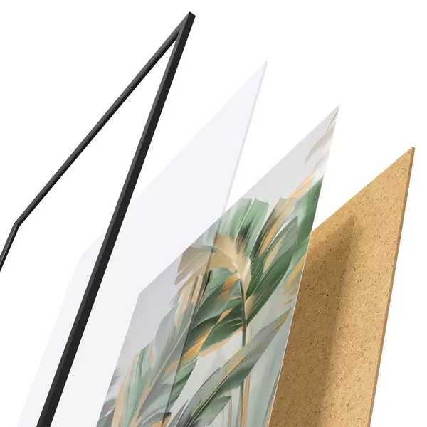 El póster consta de marco, plexiglás, imagen impresa y soporte de aglomerado. El póster puede colgarse inmediatamente en la pared gracias a los soportes de la parte posterior.