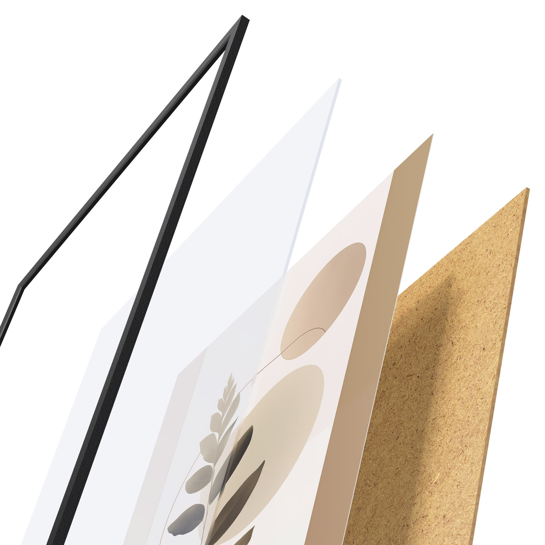 El póster consta de marco, plexiglás, imagen impresa y soporte de aglomerado. El póster puede colgarse inmediatamente en la pared gracias a los soportes de la parte posterior.