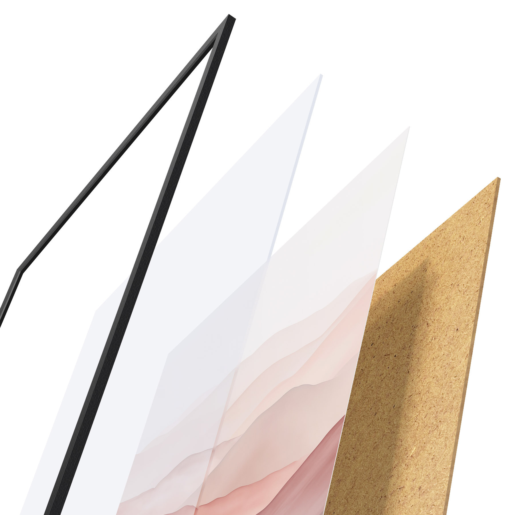 El póster consta de marco, plexiglás, imagen impresa y soporte de aglomerado. El póster puede colgarse inmediatamente en la pared gracias a los soportes de la parte posterior.
