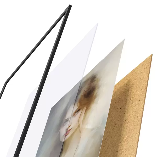 El póster consta de marco, plexiglás, imagen impresa y soporte de aglomerado. El póster puede colgarse inmediatamente en la pared gracias a los soportes de la parte posterior.