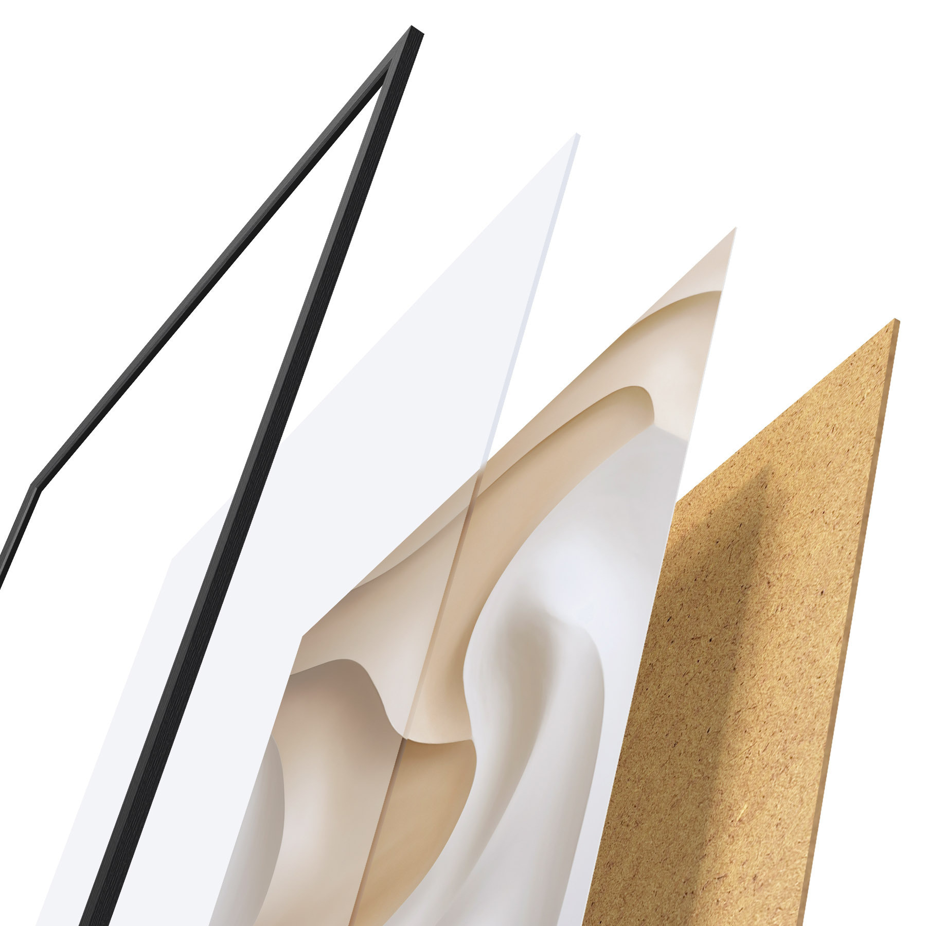 El póster consta de marco, plexiglás, imagen impresa y soporte de aglomerado. El póster puede colgarse inmediatamente en la pared gracias a los soportes de la parte posterior.