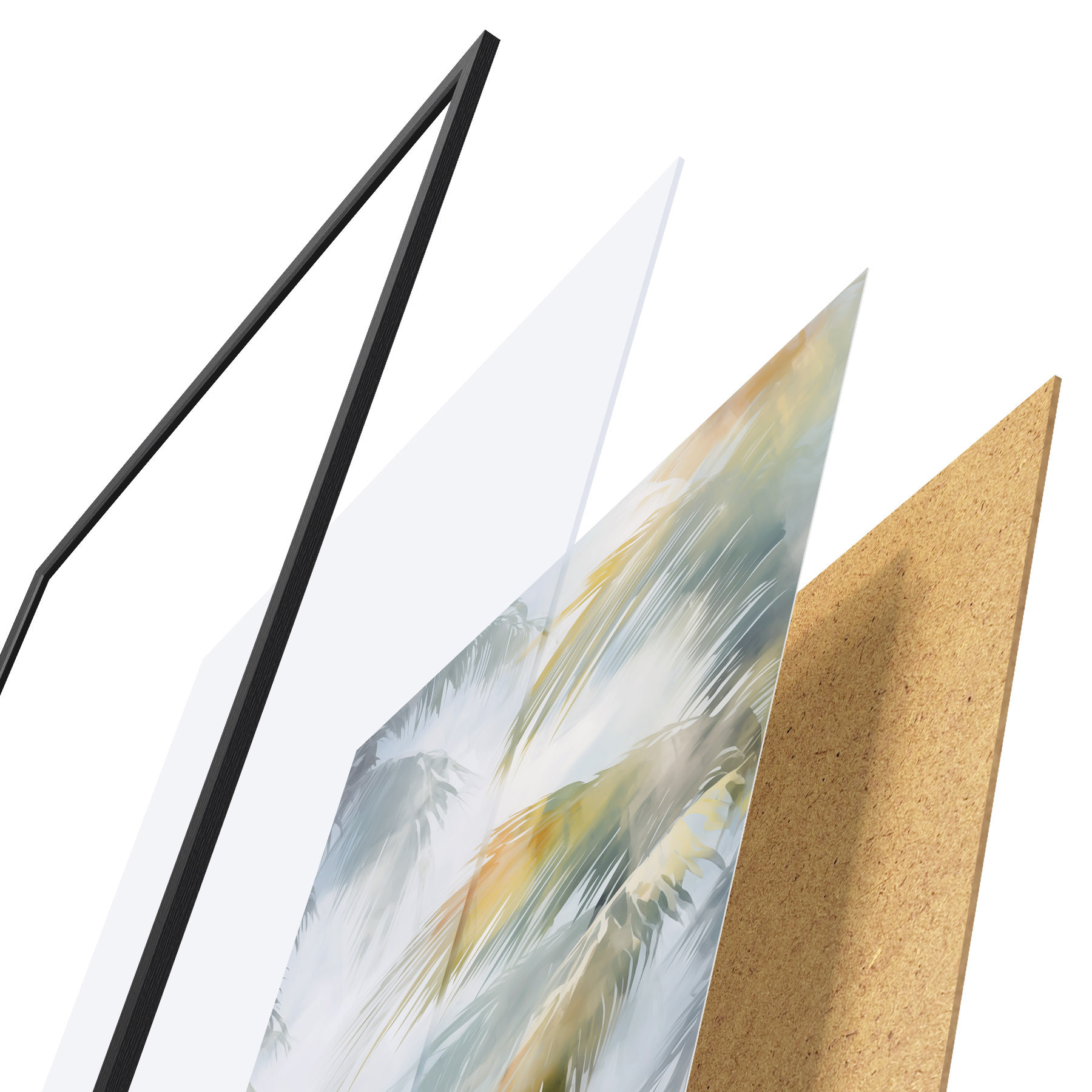 El póster consta de marco, plexiglás, imagen impresa y soporte de aglomerado. El póster puede colgarse inmediatamente en la pared gracias a los soportes de la parte posterior.