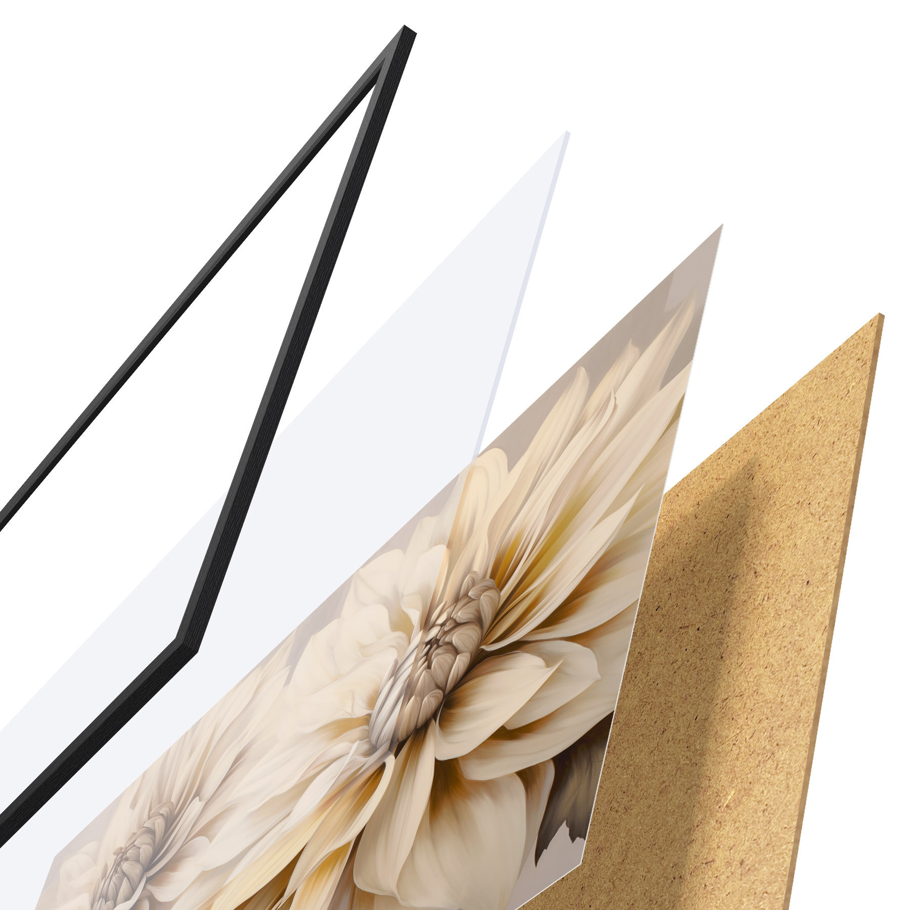 El póster consta de marco, plexiglás, imagen impresa y soporte de aglomerado. El póster puede colgarse inmediatamente en la pared gracias a los soportes de la parte posterior.