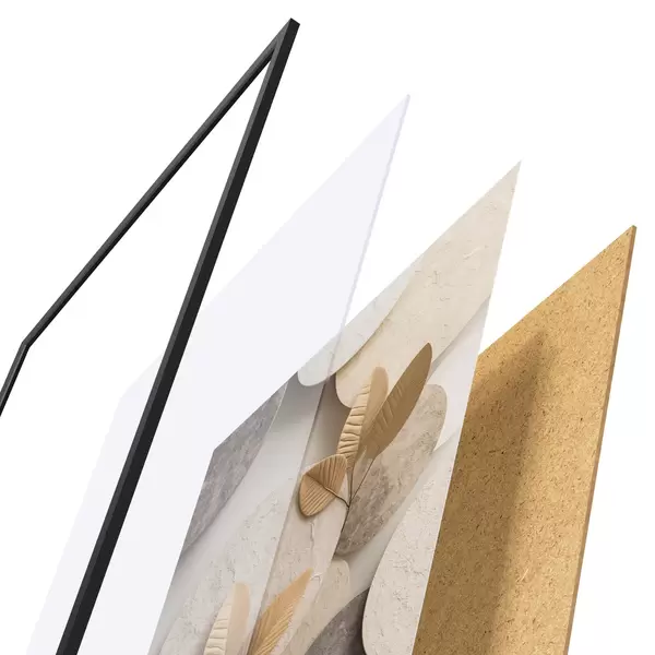 El póster consta de marco, plexiglás, imagen impresa y soporte de aglomerado. El póster puede colgarse inmediatamente en la pared gracias a los soportes de la parte posterior.
