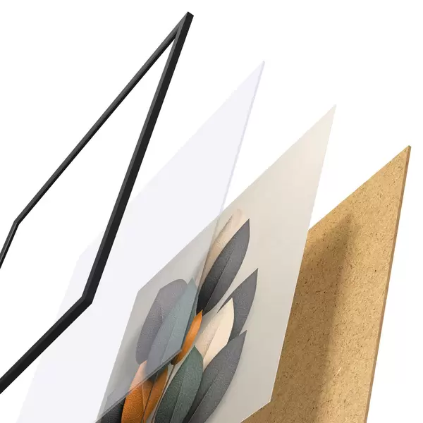 El póster consta de marco, plexiglás, imagen impresa y soporte de aglomerado. El póster puede colgarse inmediatamente en la pared gracias a los soportes de la parte posterior.