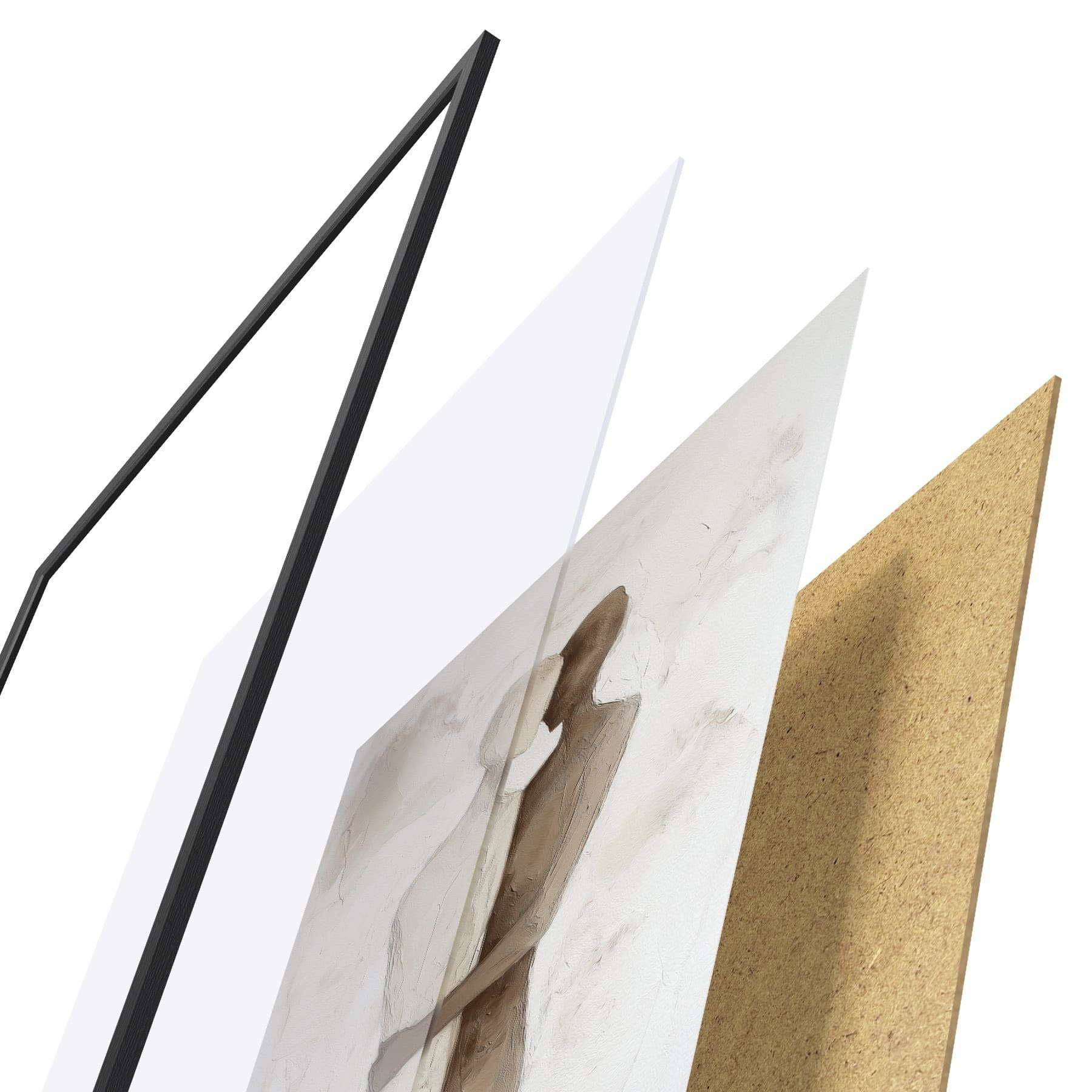 El póster consta de marco, plexiglás, imagen impresa y soporte de aglomerado. El póster puede colgarse inmediatamente en la pared gracias a los soportes de la parte posterior.