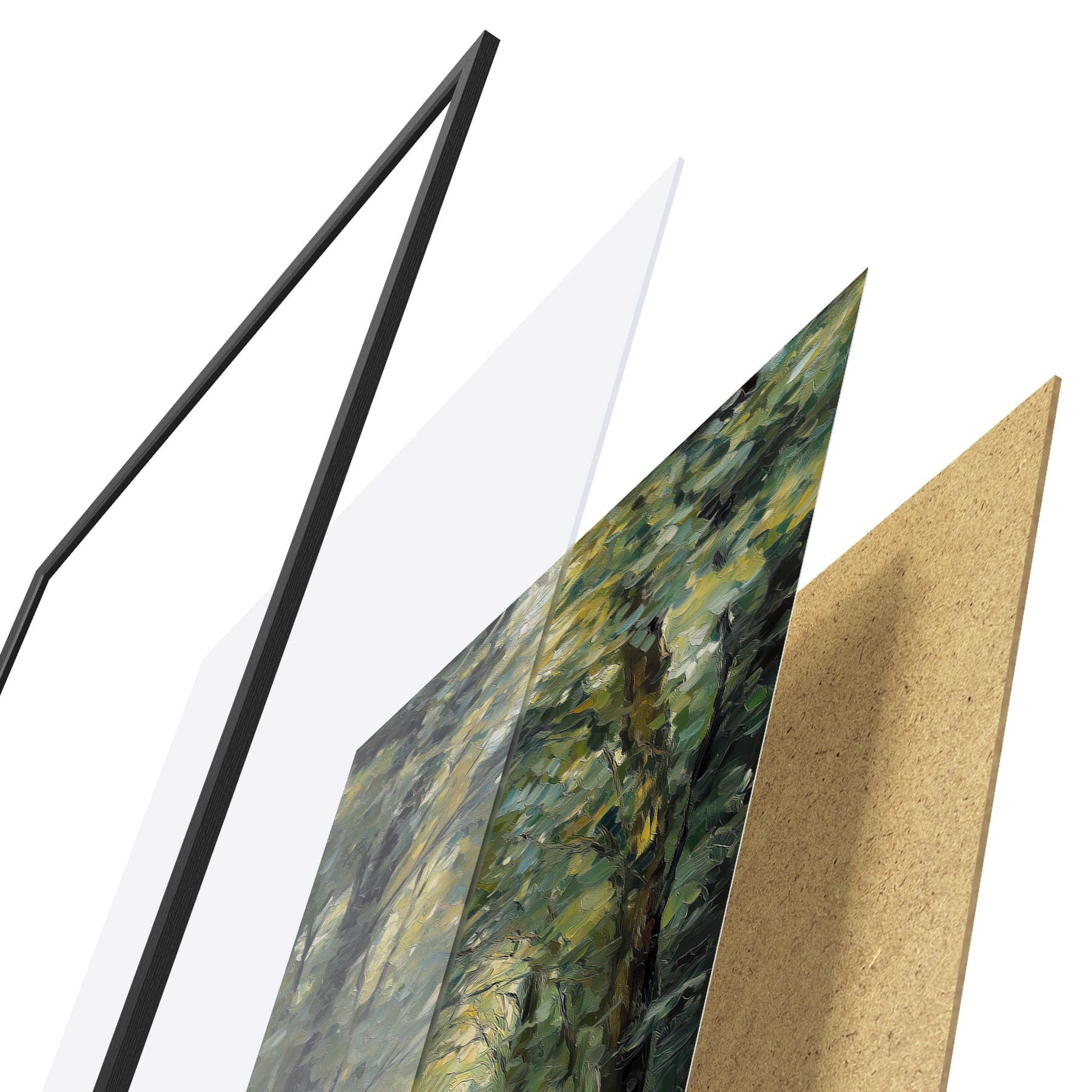 El póster consta de marco, plexiglás, imagen impresa y soporte de aglomerado. El póster puede colgarse inmediatamente en la pared gracias a los soportes de la parte posterior.
