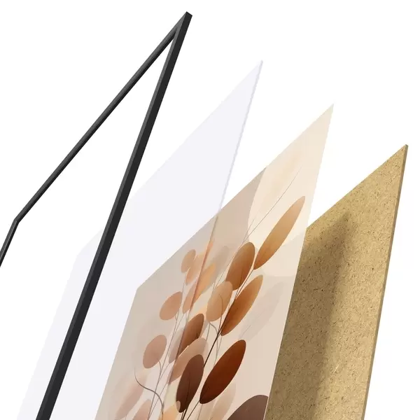 El póster consta de marco, plexiglás, imagen impresa y soporte de aglomerado. El póster puede colgarse inmediatamente en la pared gracias a los soportes de la parte posterior.