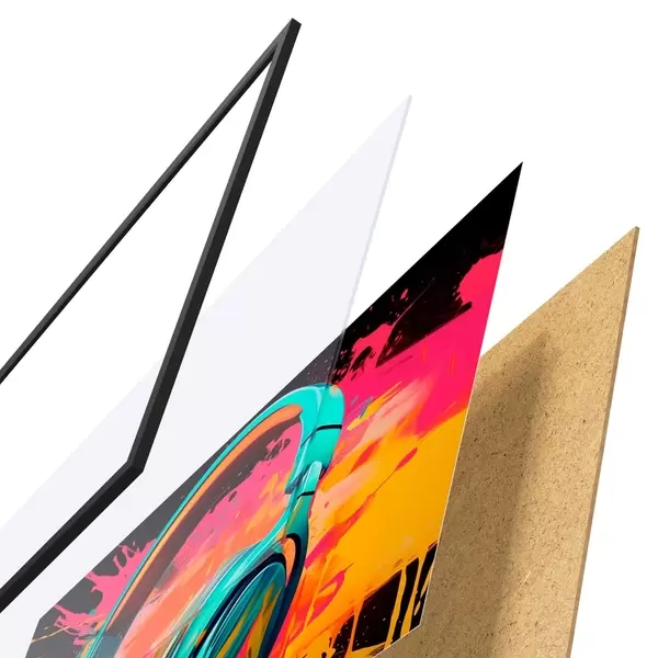 El póster consta de marco, plexiglás, imagen impresa y soporte de aglomerado. El póster puede colgarse inmediatamente en la pared gracias a los soportes de la parte posterior.