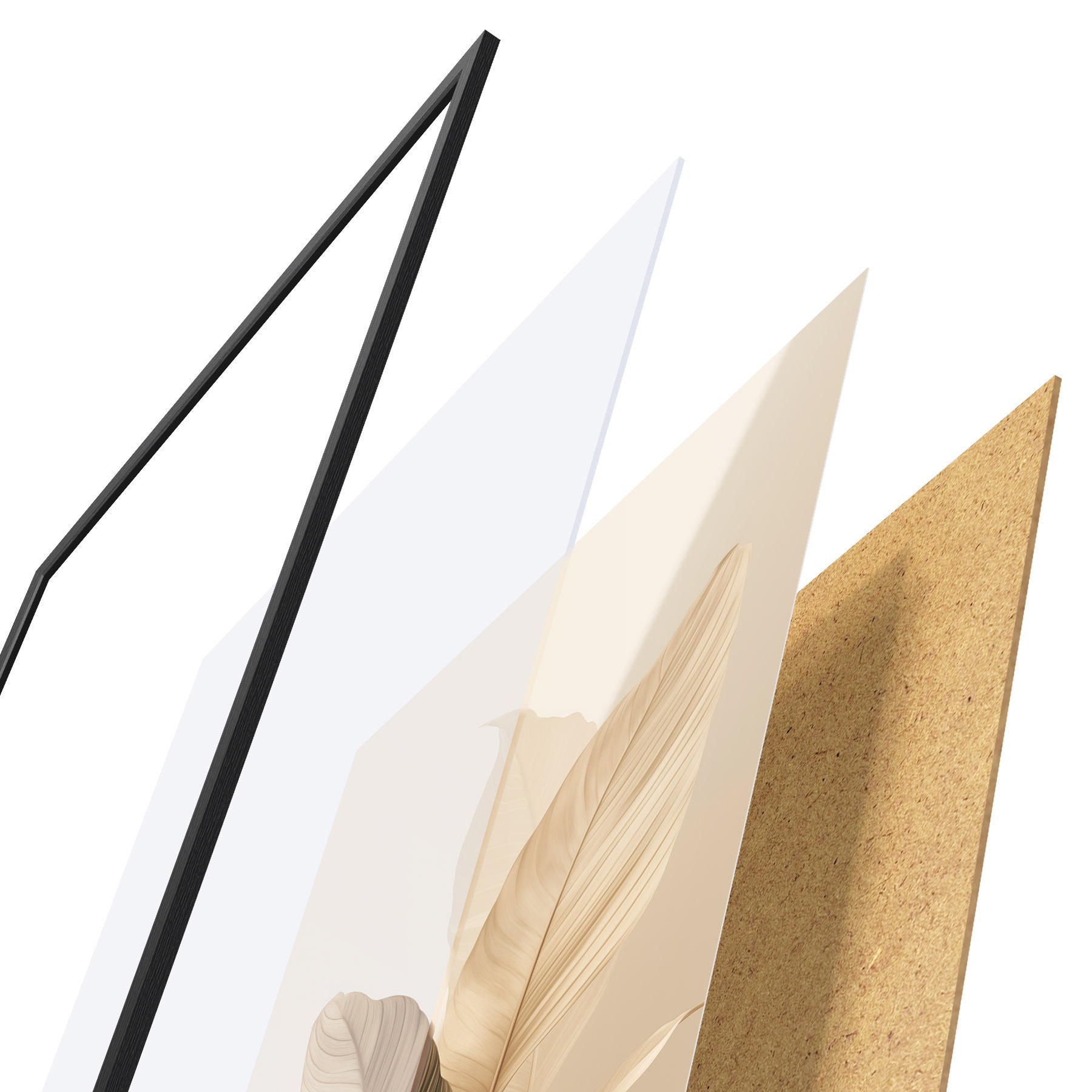 El póster consta de marco, plexiglás, imagen impresa y soporte de aglomerado. El póster puede colgarse inmediatamente en la pared gracias a los soportes de la parte posterior.