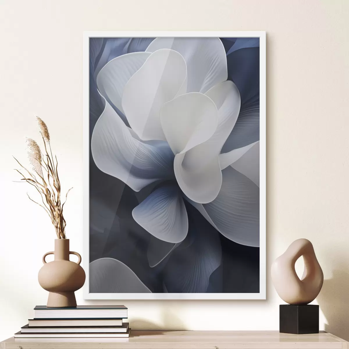 Poster Pétalos de flores abstractos en azul y blanco sobre fondo oscuro Nr f48732