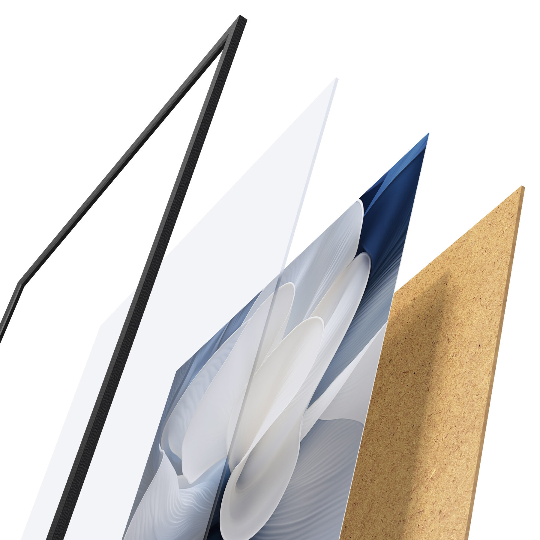 El póster consta de marco, plexiglás, imagen impresa y soporte de aglomerado. El póster puede colgarse inmediatamente en la pared gracias a los soportes de la parte posterior.