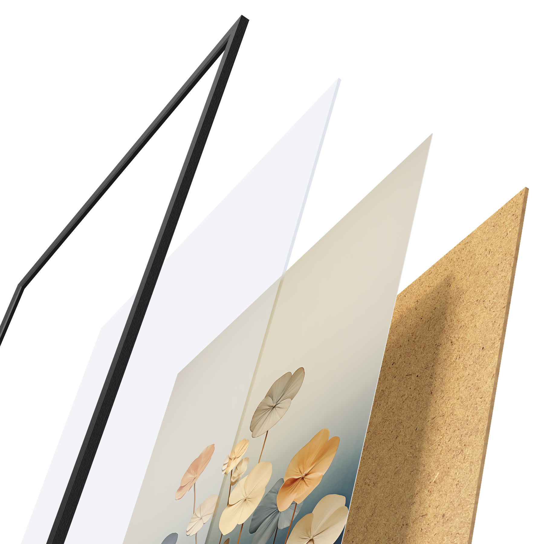 El póster consta de marco, plexiglás, imagen impresa y soporte de aglomerado. El póster puede colgarse inmediatamente en la pared gracias a los soportes de la parte posterior.