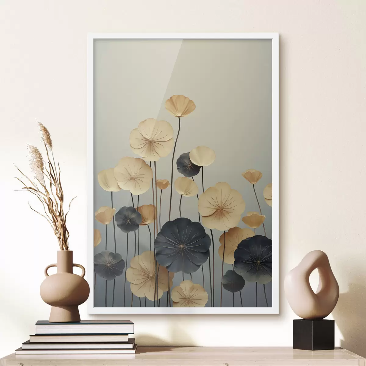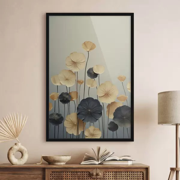Poster Hojas de nenúfar sobre un fondo en tonos apagados de beige y azul oscuro Nr f48734