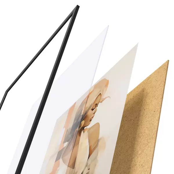 El póster consta de marco, plexiglás, imagen impresa y soporte de aglomerado. El póster puede colgarse inmediatamente en la pared gracias a los soportes de la parte posterior.