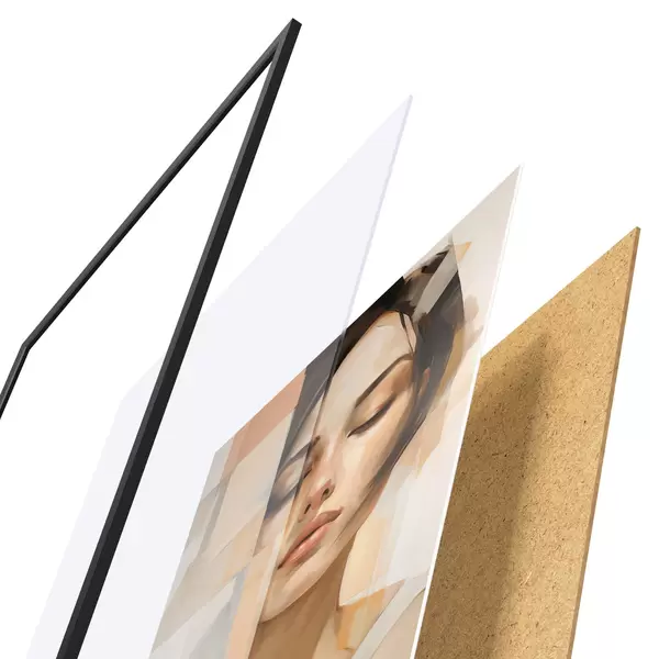 El póster consta de marco, plexiglás, imagen impresa y soporte de aglomerado. El póster puede colgarse inmediatamente en la pared gracias a los soportes de la parte posterior.