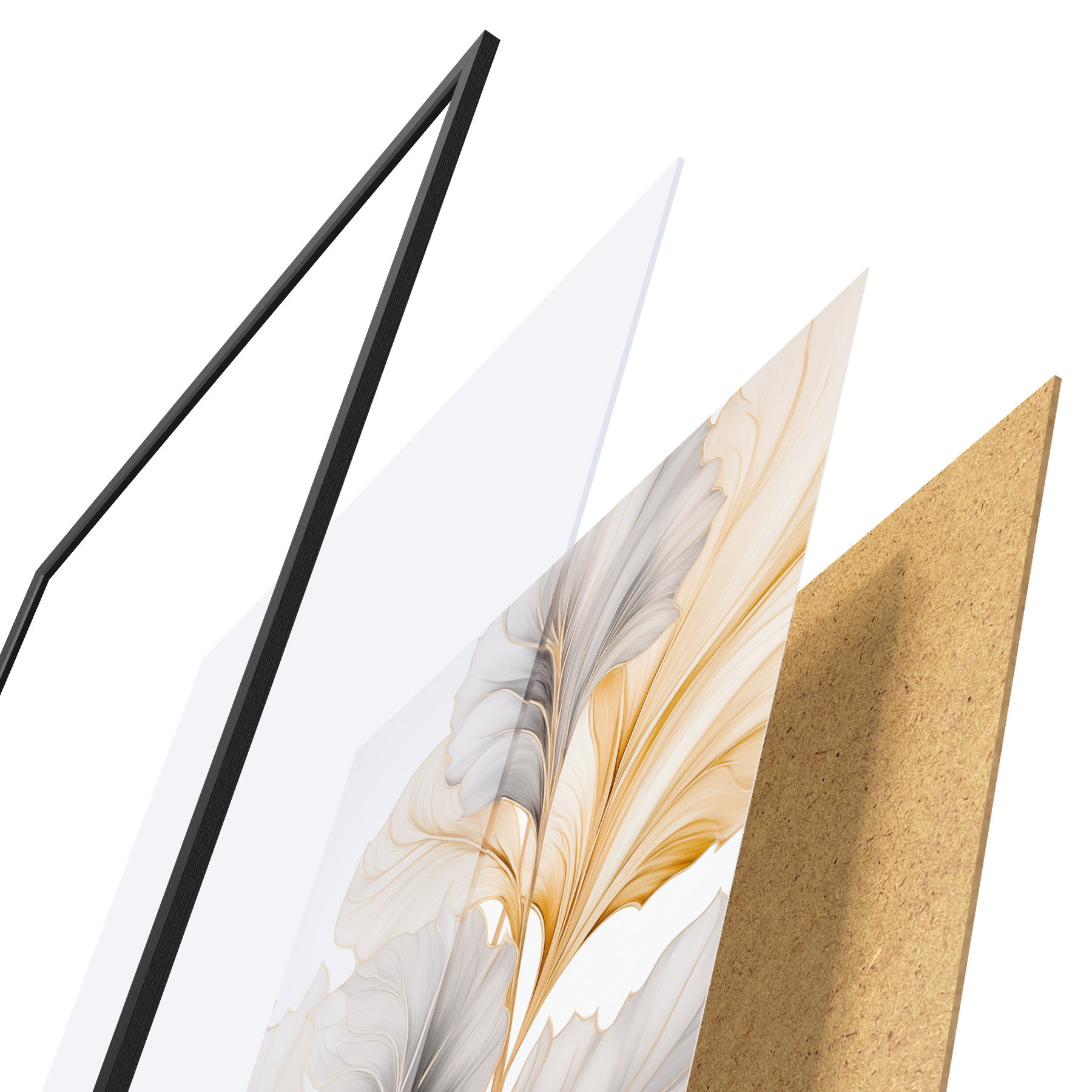 El póster consta de marco, plexiglás, imagen impresa y soporte de aglomerado. El póster puede colgarse inmediatamente en la pared gracias a los soportes de la parte posterior.
