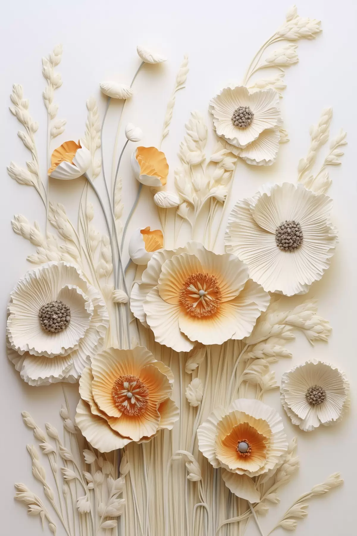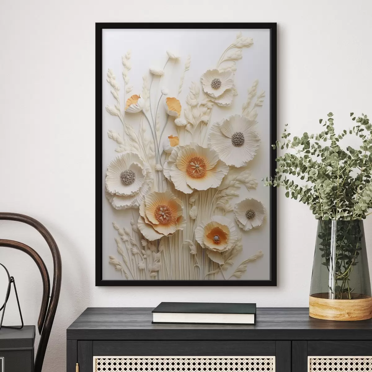 Poster Un ramo de amapolas de color crema y naranja con tallos de trigo secos f48747