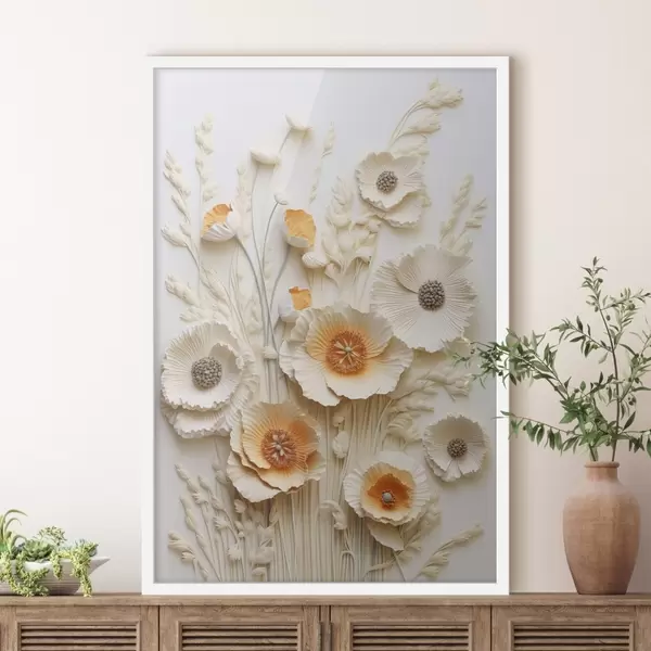 Poster Un ramo de amapolas de color crema y naranja con tallos de trigo secos Nr f48747