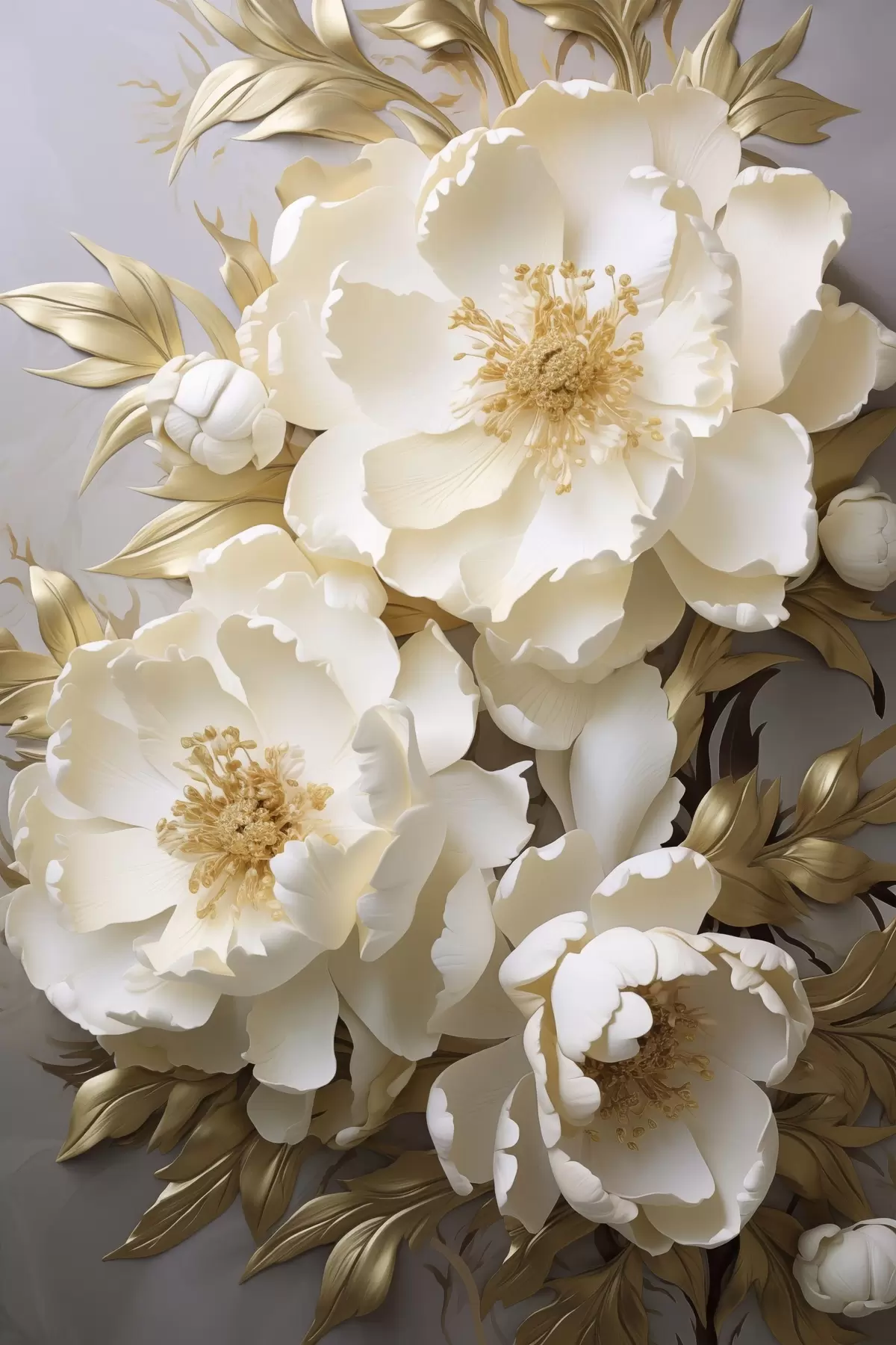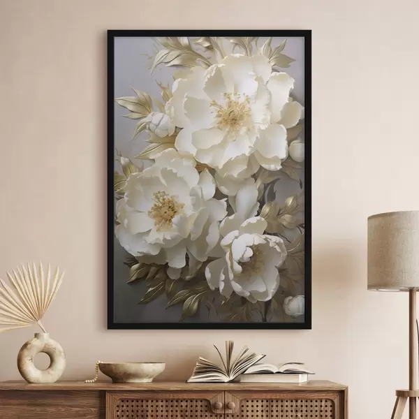 Poster Grandes peonías blancas con hojas amarillas sobre un fondo gris Nr f48754